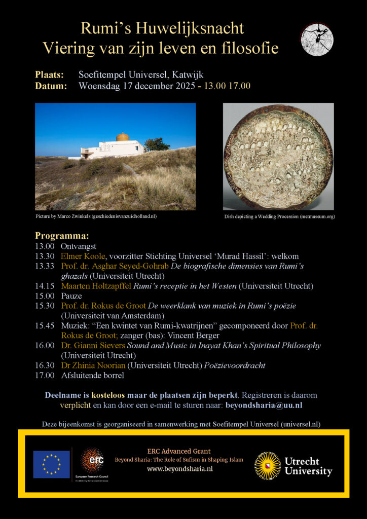 Op 17 december herdenken mensen in verschillende landen het overlijden van de spirituele dichter Jalal al-Din Rumi (1207-1273). Zijn sterven wordt beschouwd als de huwelijksnacht, het moment van eenwording van de ziel met het goddelijke. Ook wij zullen op 17 december in de Soefitempel Universel deze huwelijksnacht vieren met lezingen, muziek en poëzievoordrachten in het Perzisch. De bijeenkomst wordt gezamenlijk georganiseerd door de groep ’Beyond Sharia’ van de UvU en de Soefitempel.